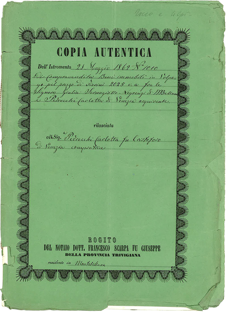 “Tòcco” è il soprannome con cui si identificavano le famiglie che abitavano, come affittuari, l’antica casa di via Fornace Vecchia 2 a Volpago del Montello, coltivando i terreni circostanti. Quando la nostra antenata Carlotta Pedrocchi, nel 1862, comprò questa proprietà da Giulia Sernaggiotto-Legrenzi di Montebelluna, l’affittuario era tale Borsato Giovanni detto “Tòcco”. Così risulta dagli atti di compravendita originali.